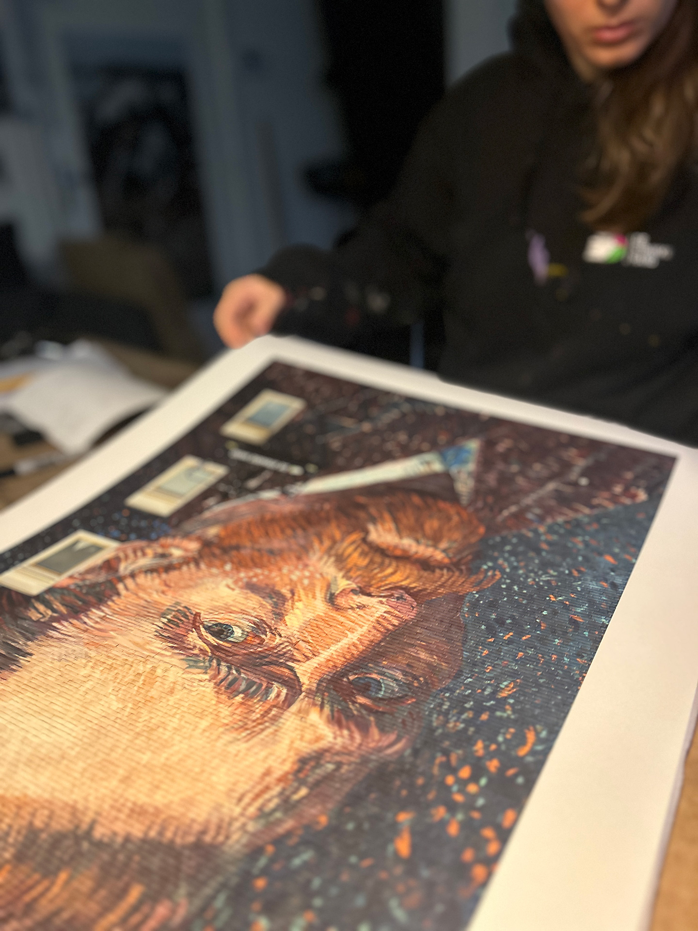 Van Gogh was een van Nederlands grootste kunstschilders. Zijn werken zijn over de gehele wereld bekend. In 2023 kregen wij de opdracht een eerbetoon aan hem te schilderen in Hoogeveen waar hij in 1883 een tijd verbleef. We kozen voor dit zelfportret door de kenmerkende schildertoets van Van Gogh. De muurschildering strekt zich uit over meerdere verdiepingen en is een van onze pronkstukken uit de collectie geworden. De muurschildering verscheen o.a. op het Journaal en jeugdjournaal. De originele foto is gemaakt door onze huisfotograaf Robert Oosterbroek. De locatie van de schildering midden in het centrum van Hoogeveen, de blik in de ogen van Vincent, de foto met een van onze kunstenaars op onze hoogwerker ervoor- alles klopt op dit beeld. Voor iedereen die een stukje van Gogh of een stukje De Strakke Hand in huis wil hebben, dit is jullie kans!